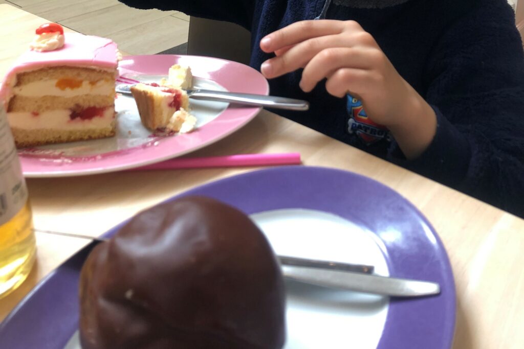 Voordat we met de dubbeldekkertrein terug naar Utrecht sjezen, eten we natuurlijk een feestelijk taartje bij de beroemdste bossche-bollen-bakker in Den Bosch. Oma smult van een Bossche bol en de kleinzoon kiest iets rozes, want dat vindt ie een mooie kleur.